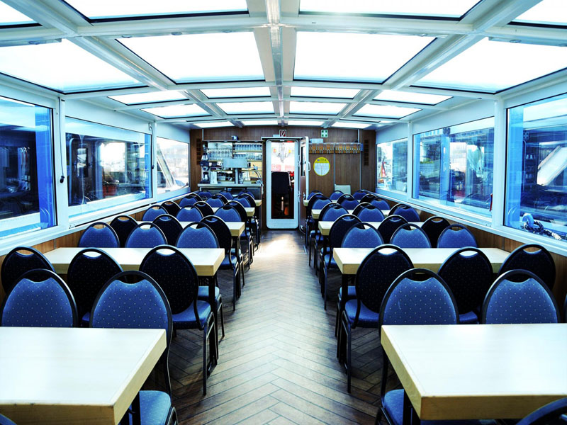 Je nach Modell können sie auf gepolsterten Bänken oder an einzelnen Tischen und Stühlen Platz nehmen und diese nach Bedarf anordnen. Die Getränkestation oder die etwaige Bar kann überdies durch ein Büffet ergänzt und Raum für eine Tanzfläche geschaffen werden. Eine leistungsfähige Sprach- und HiFi-Anlage sowie Sanitärräume runden die Ausstattung ab.