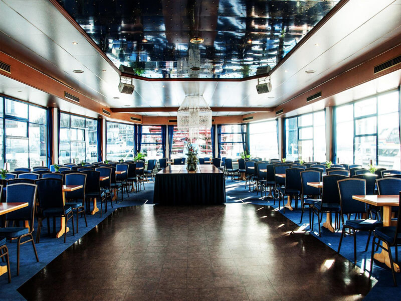 Die beiden großen Salons der MS Hamburg überzeugen durch schlichte Eleganz, azurblaue Panoramascheiben rücken den herrlichen Elb-Blick ins rechte Licht. Wegen ihrer angenehmen Sachlichkeit und einer erhöht gelegenen VIP-Lounge auf dem Hauptdeck halten Firmen hier bevorzugt Ihre Tagungen und Konferenzen ab.