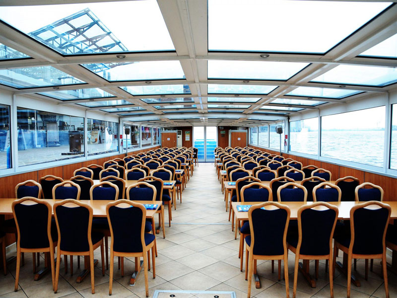 Zum stilvollen Ambiente tragen die Ausstattung in Edelstahl und Glas sowie eine großzügige Getränke-Bar bei, die durch eine gute HiFi- und Sprachanlage, einen Flachbildschirm, eine Garderobe und vier Sanitärräume komplettiert wird.