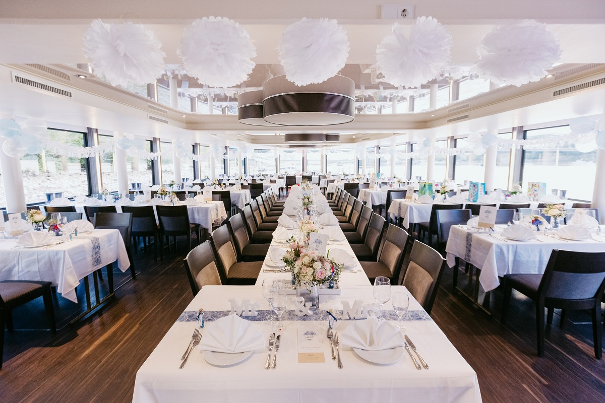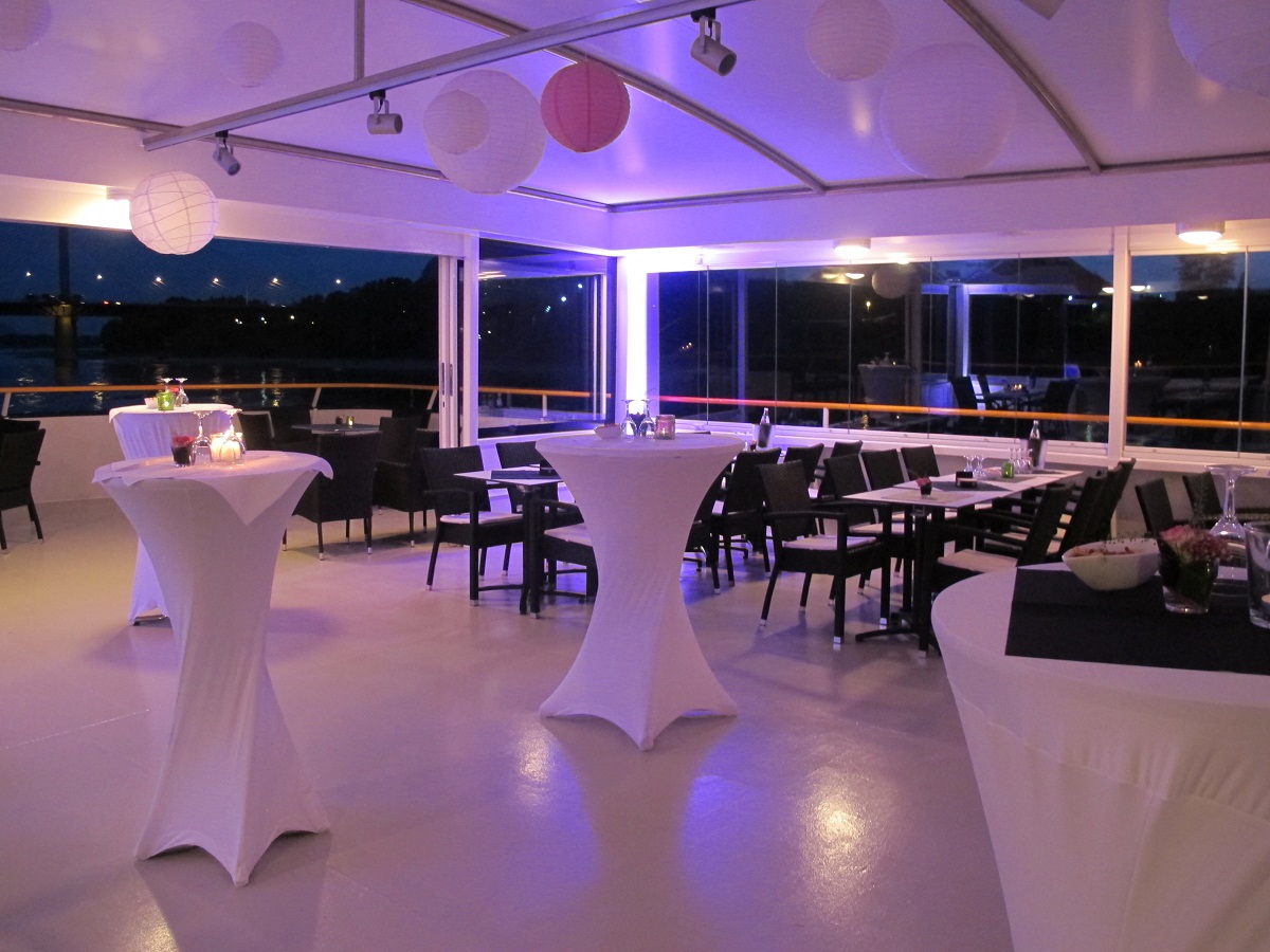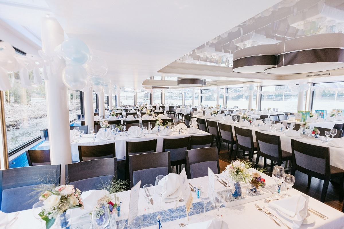 Die beiden lichtdurchfluteten Decks im Inneren unseres neuen modernen Eventschiffs lassen mit ihrer schlichten und zeitlosen Eleganz keine Wünsche offen. Sie sind stilvoll, modern und sehr variabel in Bezug auf die Bestuhlung und Dekoration. Perfekt geeignet für Firmenveranstaltungen oder private Feiern – Ihren kreativen Ideen sind keine Grenzen gesetzt!