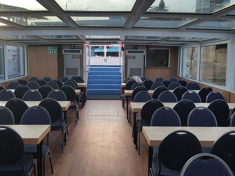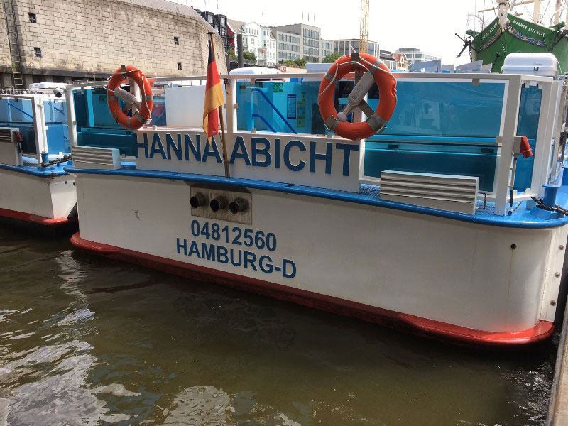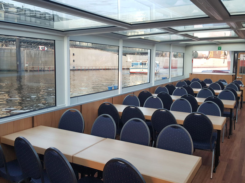 Barkasse ist extra lang und flach konzipiert, sodass bei entsprechender Tide auch eine Fahrt zur historischen Speicherstadt möglich ist. Im vollverglasten Innenraum finden bis zu 96 Personen an Tischen mit bequemen Polsterstühlen Platz. Mit einem Büffet an Bord ist der Platz für 80 Personen ausgelegt.